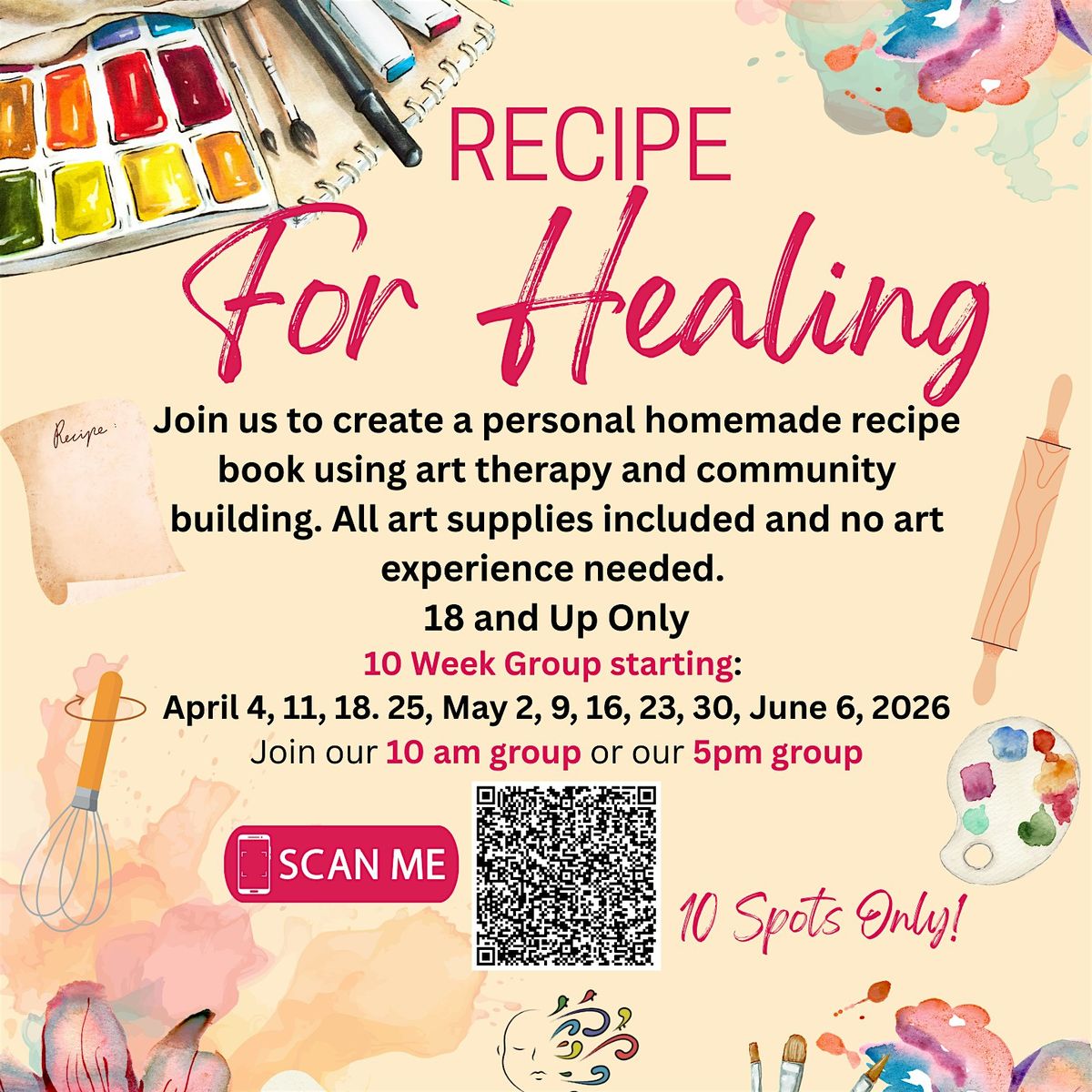 Join us to create a personal recipe book using art and reflection. Each page represents ingredients for healing, resilience, and self-care. We will swap our favorites and enjoy tasting weekly homemade samples together as a group.