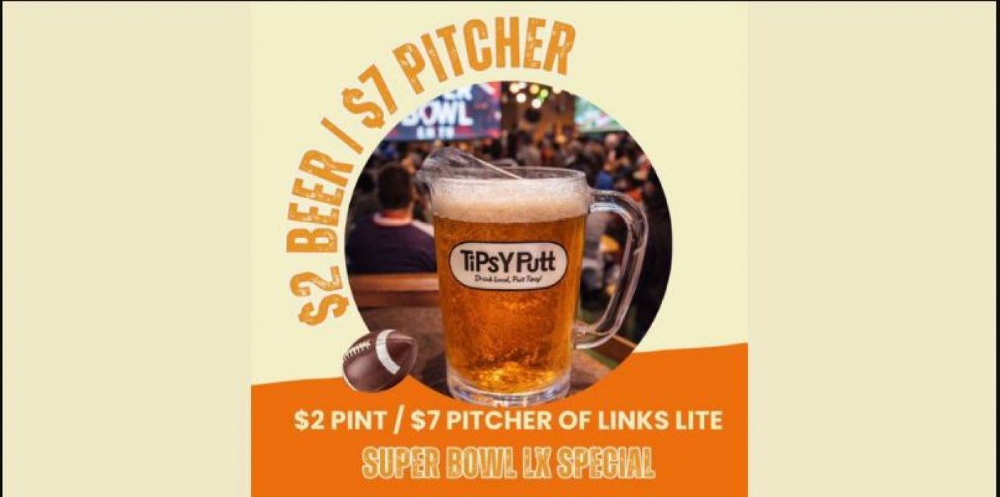 Super Bowl LX is better at Tipsy Putt. Join us for the biggest game of the year and score unbeatable drink specials all day long: