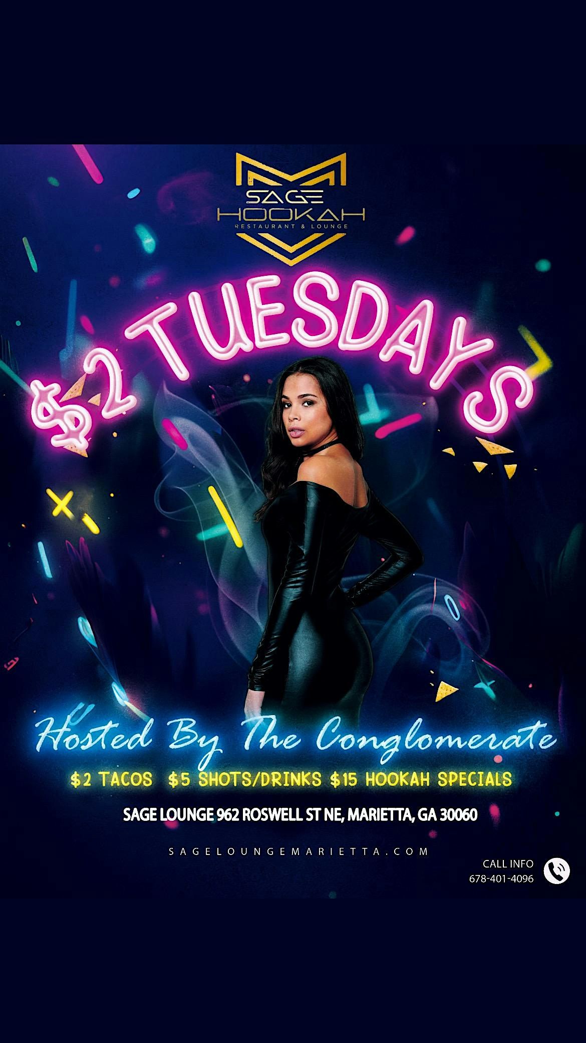 This is the place to be in the Atlanta metro on Tuesday evenings! $2 Tacos, $5 Shots/Drinks, & $15 Hookah Specials. Happy Hour kicks off at 6pm and transforms into the ultimate hookah lounge vibes until 2am. This event is hosted by The Conglomerate, where the raffle giveaways and celebrity special guests are the standard. We look forward to serving and connecting!