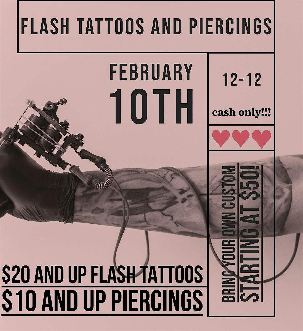 $20 AND UP FLASH TATTOOS AND $10 AND UP PIERCINGS TUESDAY FEBRUARY 10TH