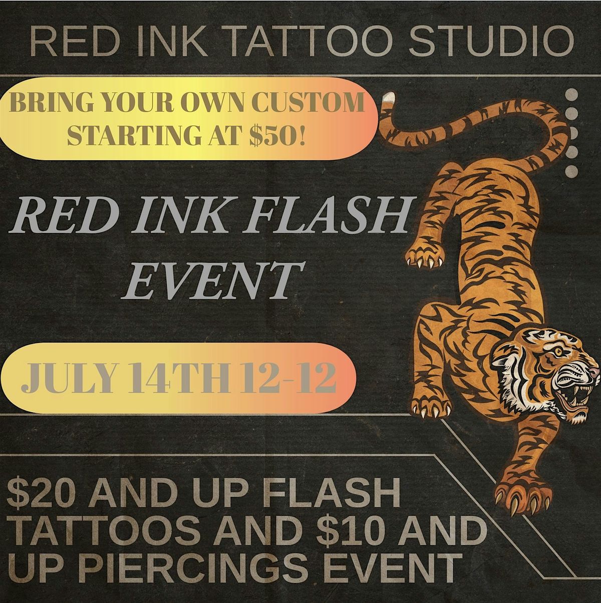 Hey there ink lovers! Get ready for an exciting event at Redink Tattoo Studio on JULY 14TH!! 2026 at 12:00 PM! We're offering flash tattoos starting at $20 and piercings starting at $10. Come join us for a day filled with creativity and self-expression. See you there!