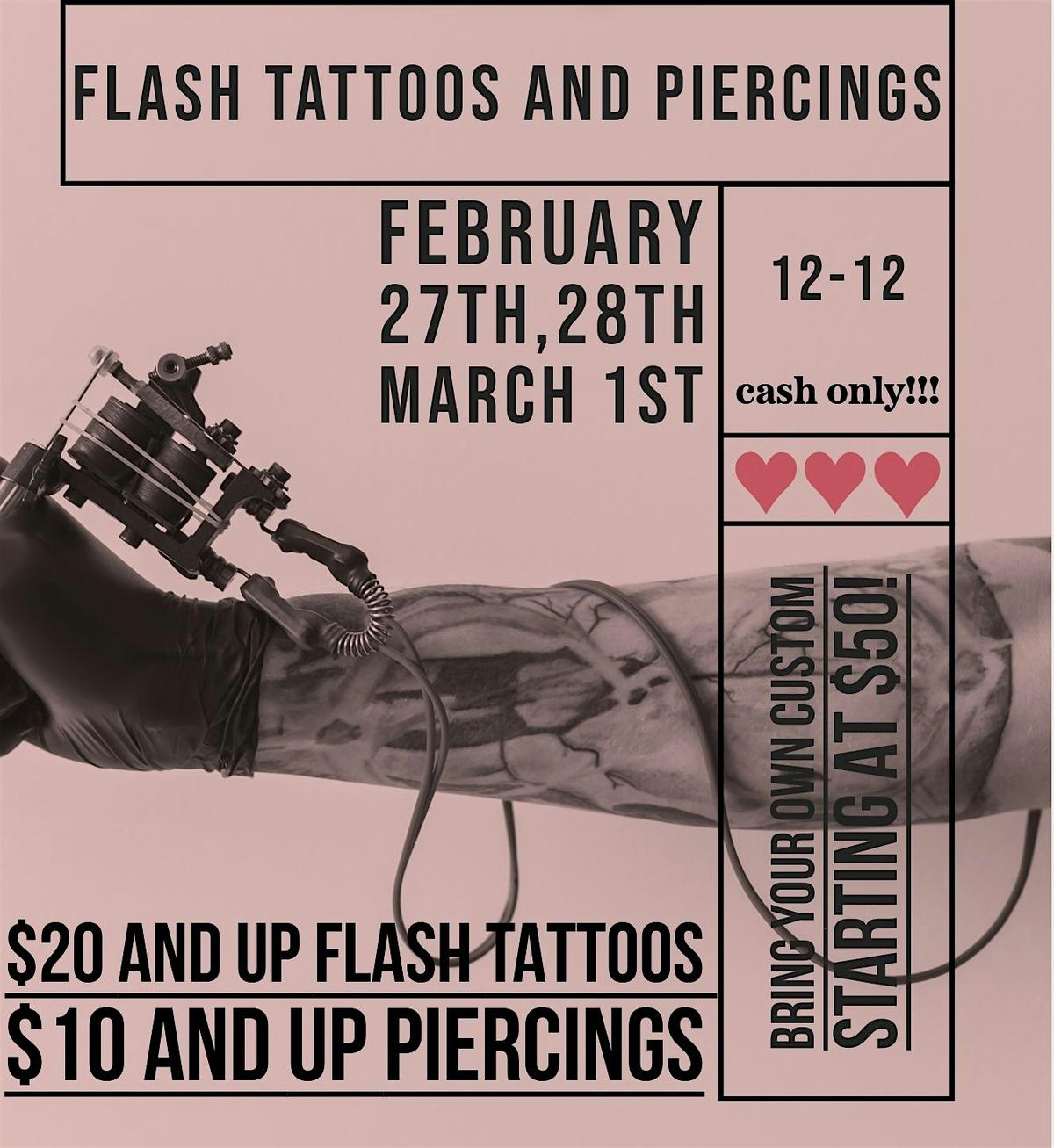 $20 AND UP FLASH TATTOOS AND PIERCINGS FEBRUARY 27TH, 28TH MARCH 1ST