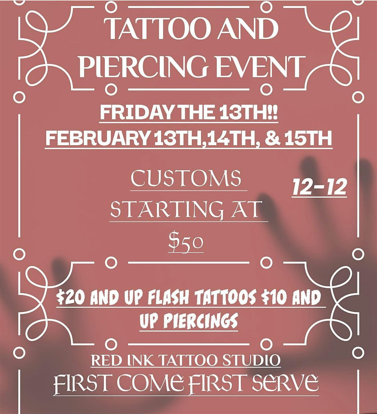 Hey there ink lovers! Get ready for an exciting event at Redink Tattoo Studio on February 13th, 14th, and 15th! 2025 at 12:00 PM! We're offering flash tattoos starting at $20 and piercings starting at $10. Come join us for a day filled with creativity and self-expression. See you there!