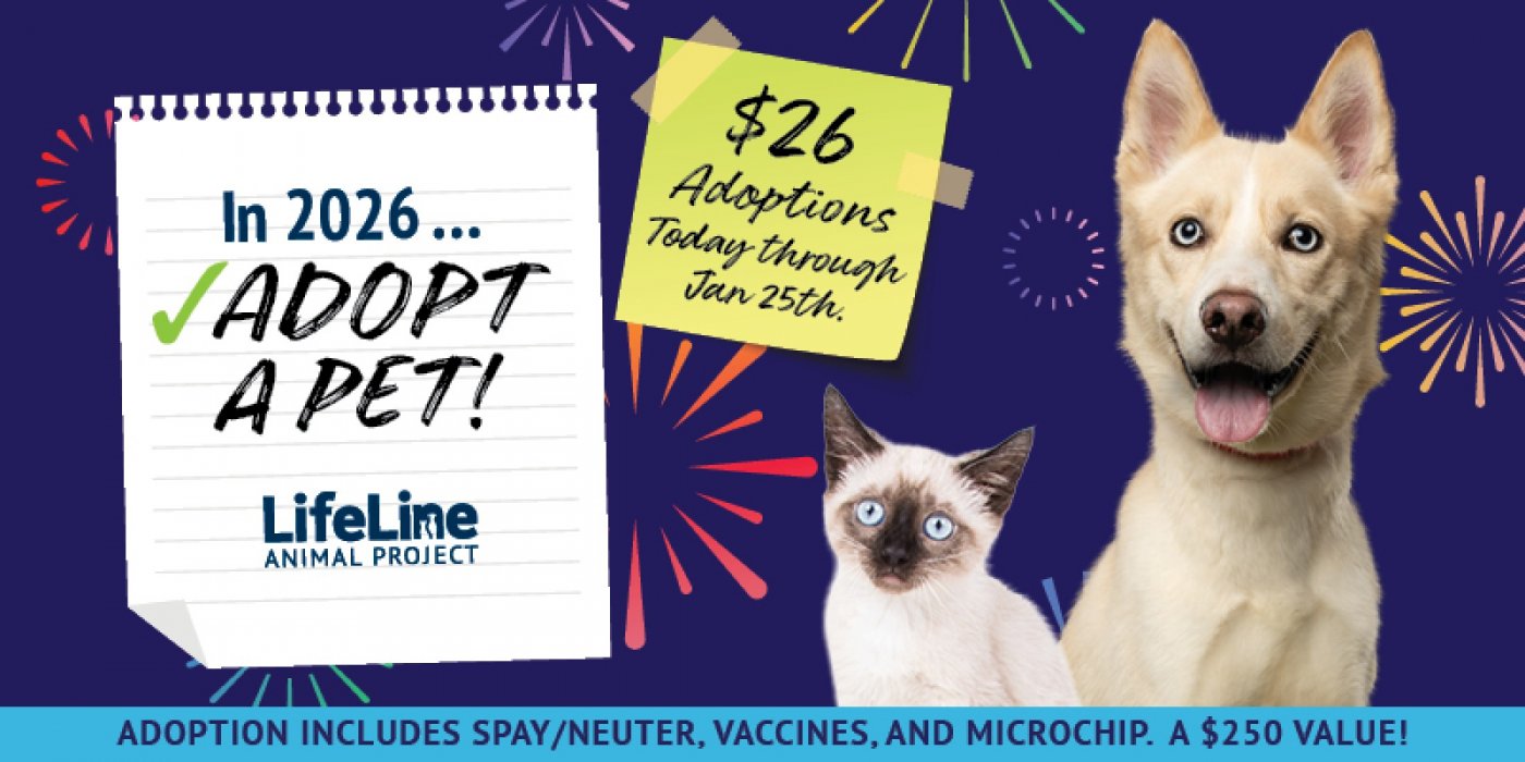 Looking for a new best friend in 2026? Start the new year off right by adopting a shelter pet! We are offering $26 adoptions at all LifeLine shelters January 21st through 25th.