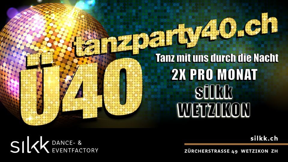 Tanzparty40.ch - Seit Jahren ein Garant für atemberaubende und durchgetanzte Nächte einer lebendigen Ü40 Generation. Ob mit Freunden in der reservierten Lounge, als Paar für einen feinen Cocktail an der Bar oder als Single auf der Tanzfläche, bei uns ist jeder willkommen. Getanzt wird zu Musik aus den 70er über die 80er & 90er bis hin zu den aktuellen Charts, serviert von den angesagtesten Ü40 DJ's des Landes. Kommt vorbei und seid Teil der kultigsten Ü40 Party-Bewegung der Region - wir freuen uns auf Euch.