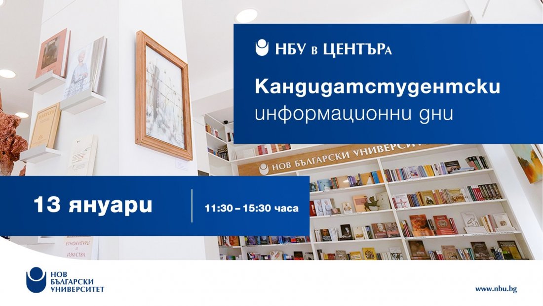 На 13. януари 2024 г. в книжарница и галерия „НБУ в ЦЕНТЪРа“ ще се проведе „Информационен ден за кандидат-студенти“ от 11.30 ч. до 15.30 ч.