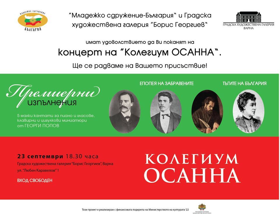В Градска художествена галерия "Борис Георгиев", Варна, по проект на Младежко сдружение-България, реализиран с финансовата подкрепа на Министерството на културата '22, “Колегиум ОСАННА” ще изпълни за първи път произведения на композитора Георги Попов, полагащи основите на един своеобразен музикален Пантеон. Ще прозвучат четири малки кантати за пиано и гласове по стихове на Иван Вазов. От “Епопея на забравените” - “Раковски” (с фрагмент от неговото “Символ верую”), “Левски”, “Паисий” и от “Тъгите на България” - “Лейди Странгфорд”. За първи път ще прозвучат и клавирни и цигулкови миниатюри, както и малка кантата върху един от първите анонимни поетични текстове в българската литература “Похвала за цар Симеон”.Концертът е с ВХОД СВОБОДЕН.