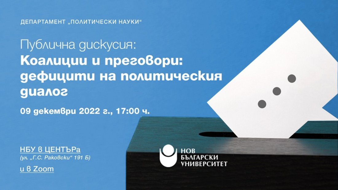 Департамент „Политически науки“ и НБУ в ЦЕНТЪРа отправят покана за участие във втора среща от серията от дебати посветени на актуални политически проблеми на 9 декември 2022 г. от 17.00 ч. Събитието ще се проведе в книжарница и галерия НБУ в ЦЕНТЪРа на ул. „Г. С. Раковски“ 191Б.