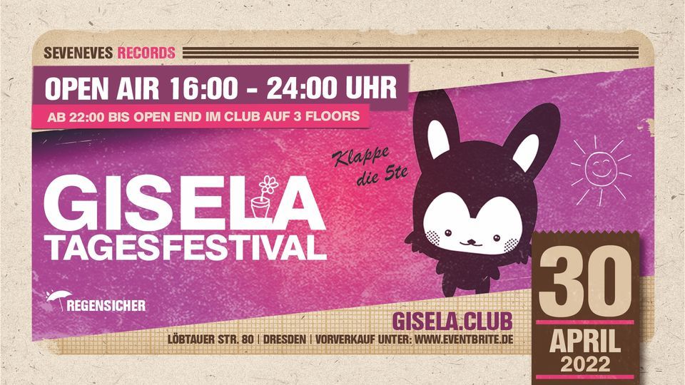 Klappe die Fünfte: Wir feiern endlich wieder draußen unter freiem Himmel mit gaaaaanz vielen Freunden, frischer Luft, leckeren Drinks und lauter guter Musik. Am 30.04.2022 gibt es für euch die fünfte Fortsetzung des Gisela Tagesfestivals! Das wahrscheinlich erste und gemütlichste Open Air 2022 in Dresden und Umgebung mit dem wahrscheinlich schönsten Wetter und dem wahrscheinlich coolsten Line Up der Stadt. ?