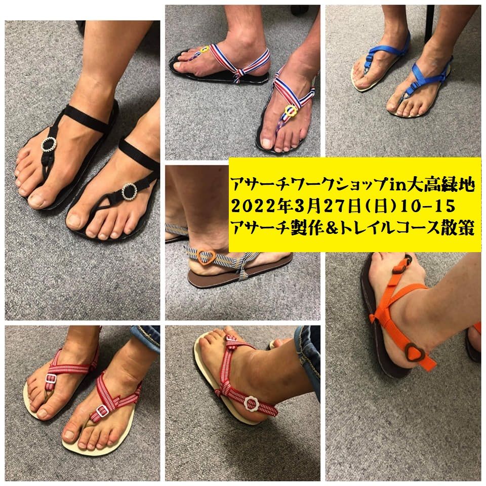 ワラーチ職人の麻さんこと、板井麻恵さんをお迎えして、アサーチのワークショップを開催します。ワークショップの後は裸足or完成したアサーチで園内のトレイルを散歩したいと思います。