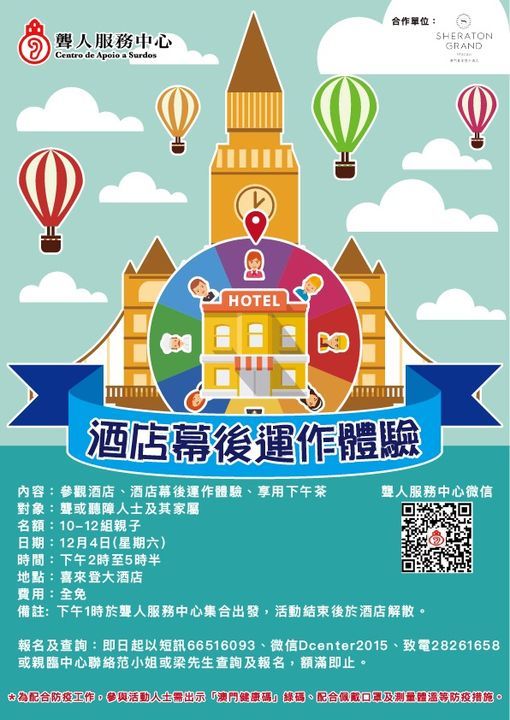 內容:參觀酒店、酒店幕後運作體驗、享用下午茶對象:聾或聽障人士及其家屬