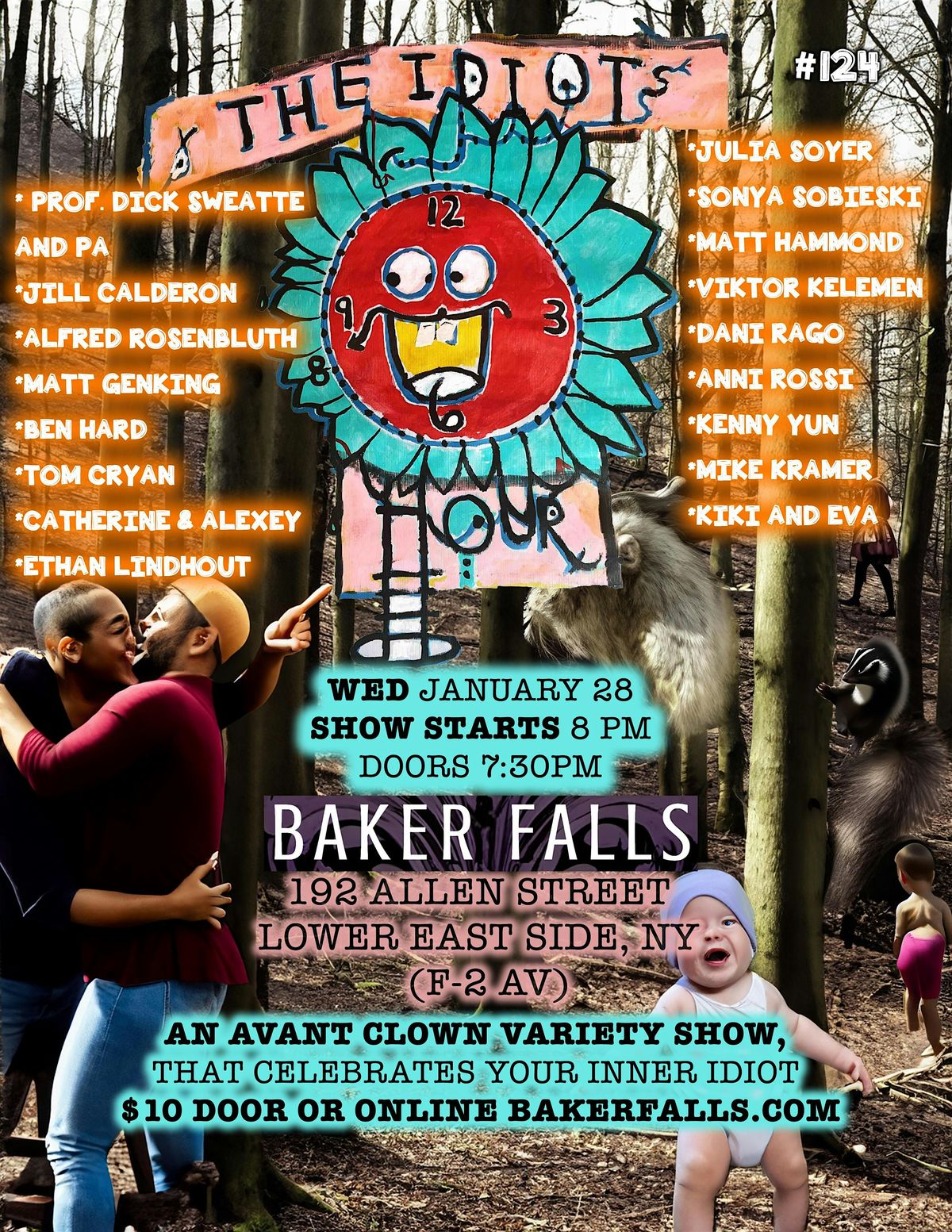 A two-hour Avant-Clown variety show celebrating your Inner Idiot! Featuring 10–12 clown performances—with a 15 min. intermission. Happening at Baker Falls in the Lower East Side.
