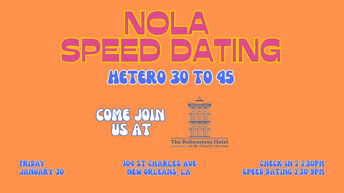 Thank you for your interest in attending a NOLA Speed Dating Event! We will be hosting this round at The Rubenstein Hotel at 104 St Charles Ave. This event is designed for people attracted to the opposite gender between the ages of 30 to 45.