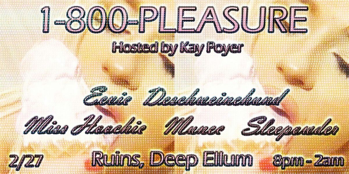 Join us Friday February 27th at Ruins, Deep Ellum for 1-800-PLEASURE, a night with dancers, vintage lingerie and rave clothing vendors, and the sexiest music curators! Hosted by the iconic Kay Poyer and featuring DJs Miss Hoochie, Eevie, Sleepowder, Muñec, and Deschweinehund! Doors open at 8 and DJs will spin from 8:30 PM to 2:00 AM. We'll see you there!
