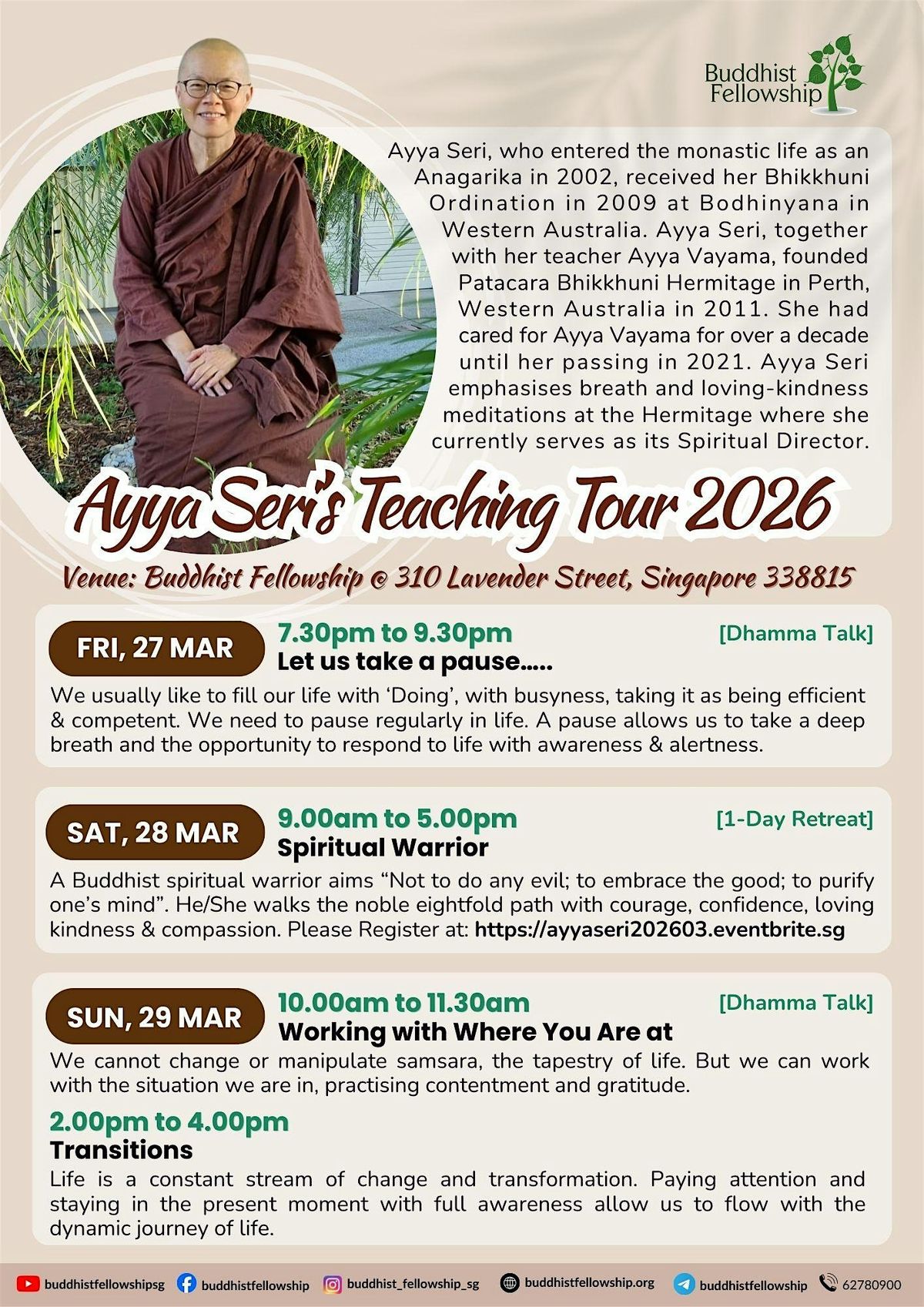 Ayya Seri, who entered the monastic life as an Anagarika in 2002, received her Bhikkhuni Ordination in 2009 at Bodhinyana Monastery in Western Australia. Ayya Seri, together with her teacher Ayya Vayama, founded Patacara Bhikkhuni Hermitage in Perth, Western Australia in 2011. She had cared for Ayya Vayama for over a decade until her passing in 2021. Ayya Seri emphasises breath and loving-kindness meditations at the Hermitage where she currently serves as its Spiritual Director.
