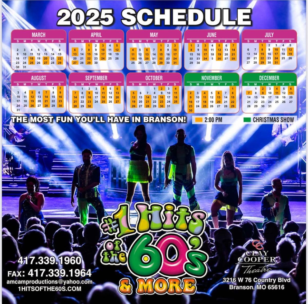 🎉 Welcome to #1 Hits of The 60s, where dreams come alive and possibilities are endless! 🏛️ Join us at Clay Cooper Theatre in the heart of Branson, MO for an event that defies expectations. 📅 On October 25th, 2025 at 06:00 PM, be part of something truly extraordinary as we bring together innovation, entertainment, and pure magic. ✨ Every aspect has been carefully designed to ensure an unforgettable experience for all our guests. Whether you're seeking adventure, inspiration, or simply a break from the ordinary, this event promises to deliver beyond your wildest dreams. 🎊 Prepare for a journey into the extraordinary!http://maps.seatics.com/ClayCooperTheatre_Endstage_2024-04-24_2024-04-24_1544_04242024_090959_SVGC_tn.png