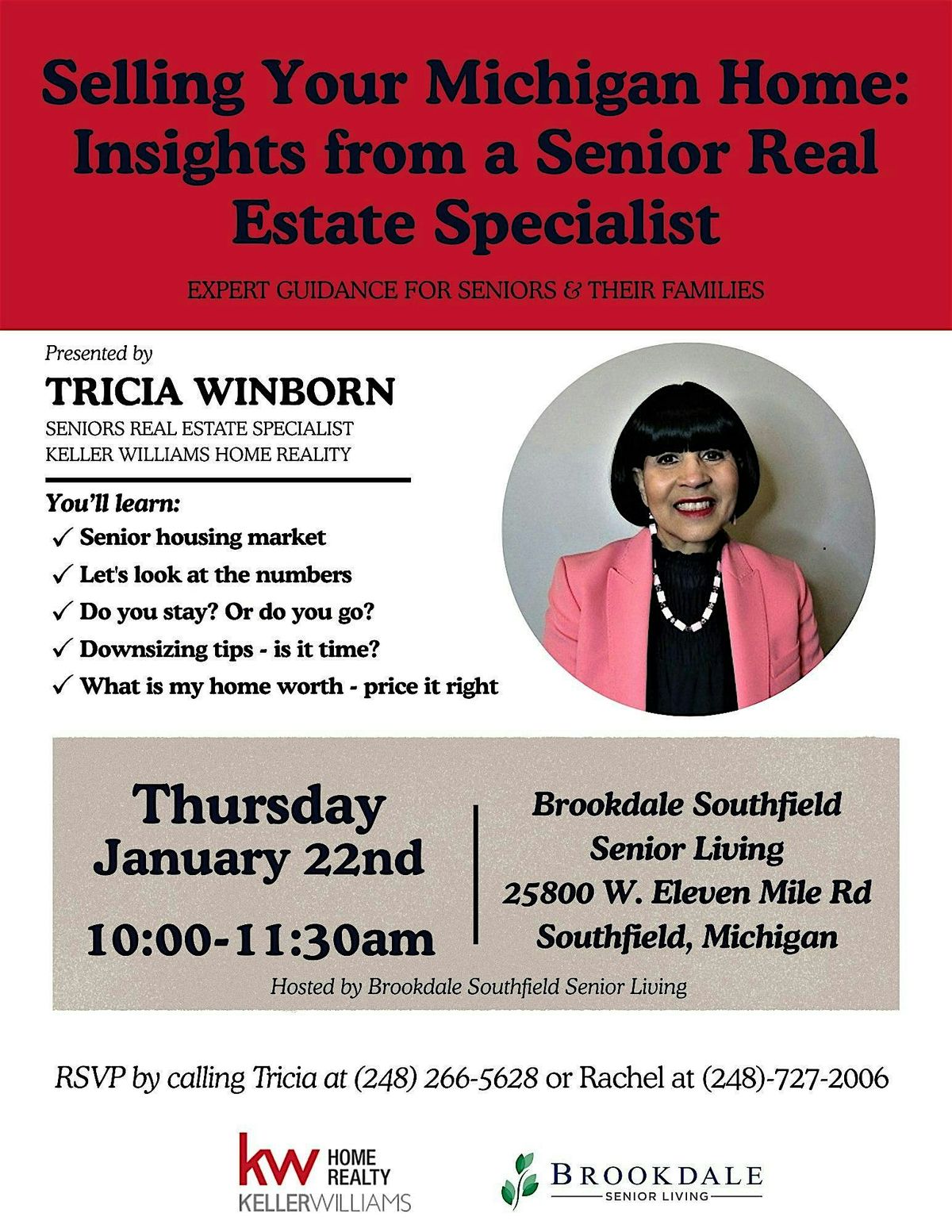 Welcome to Selling Your Michigan Home: Insights from a Senior Real Estate Specialist event! Join us at 25800 W 11 Mile Rd on January 22, 2026 at 10:00 AM (Eastern Time) for a valuable session on selling your home in Michigan. Tricia Winborn will share insights and tips to help you navigate the real estate market with ease. Don't miss out on this opportunity to gain knowledge and confidence in selling your home. See you there!