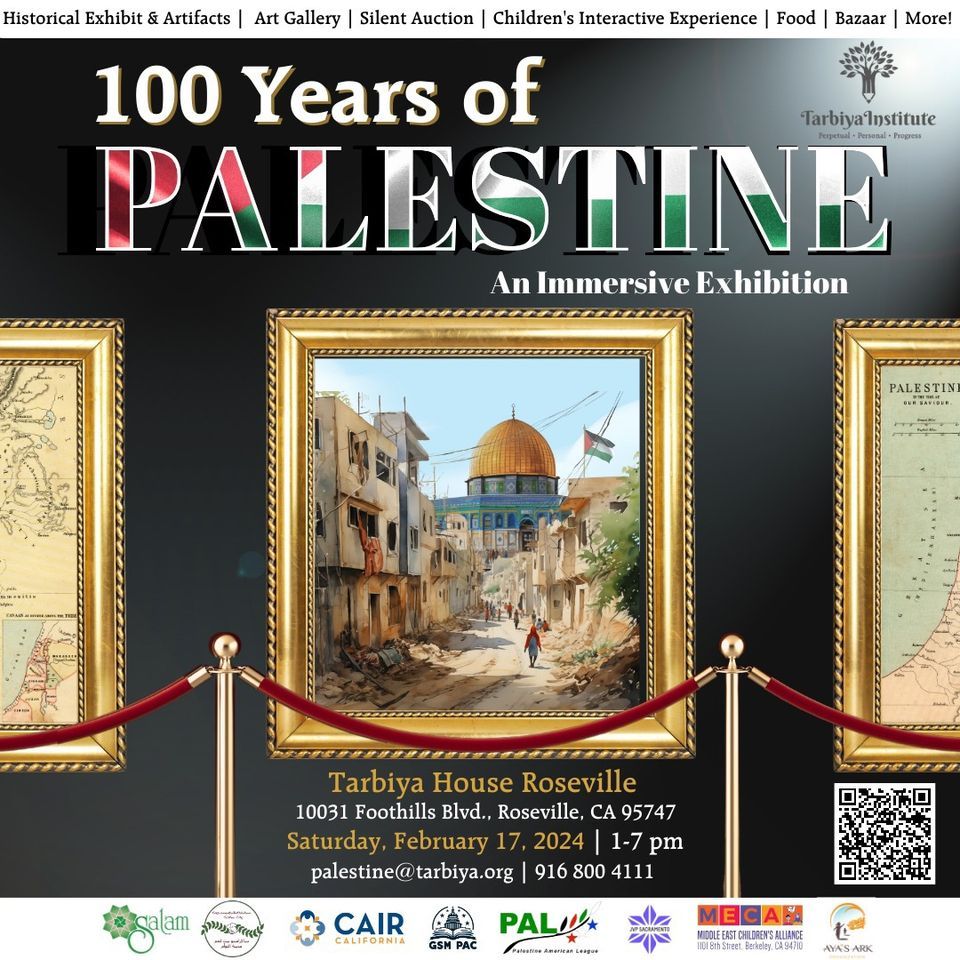 Step into the heart of Palestine's rich history at the "100 Years of Palestine". An Immersive Exhibition, proudly hosted by Tarbiya Institute in Northern California. Join concerned citizens, people of conscience, and diverse faith communities for a unique journey into the Holy Land's cultural roots and heritage. This captivating event features art, historical artifacts, and immersive experiences, providing a firsthand look at the beauty and resilience of Palestine. Uncover the true symbols of integrity, strength, courage, honor, and dignity embodied by the Palestinian people.