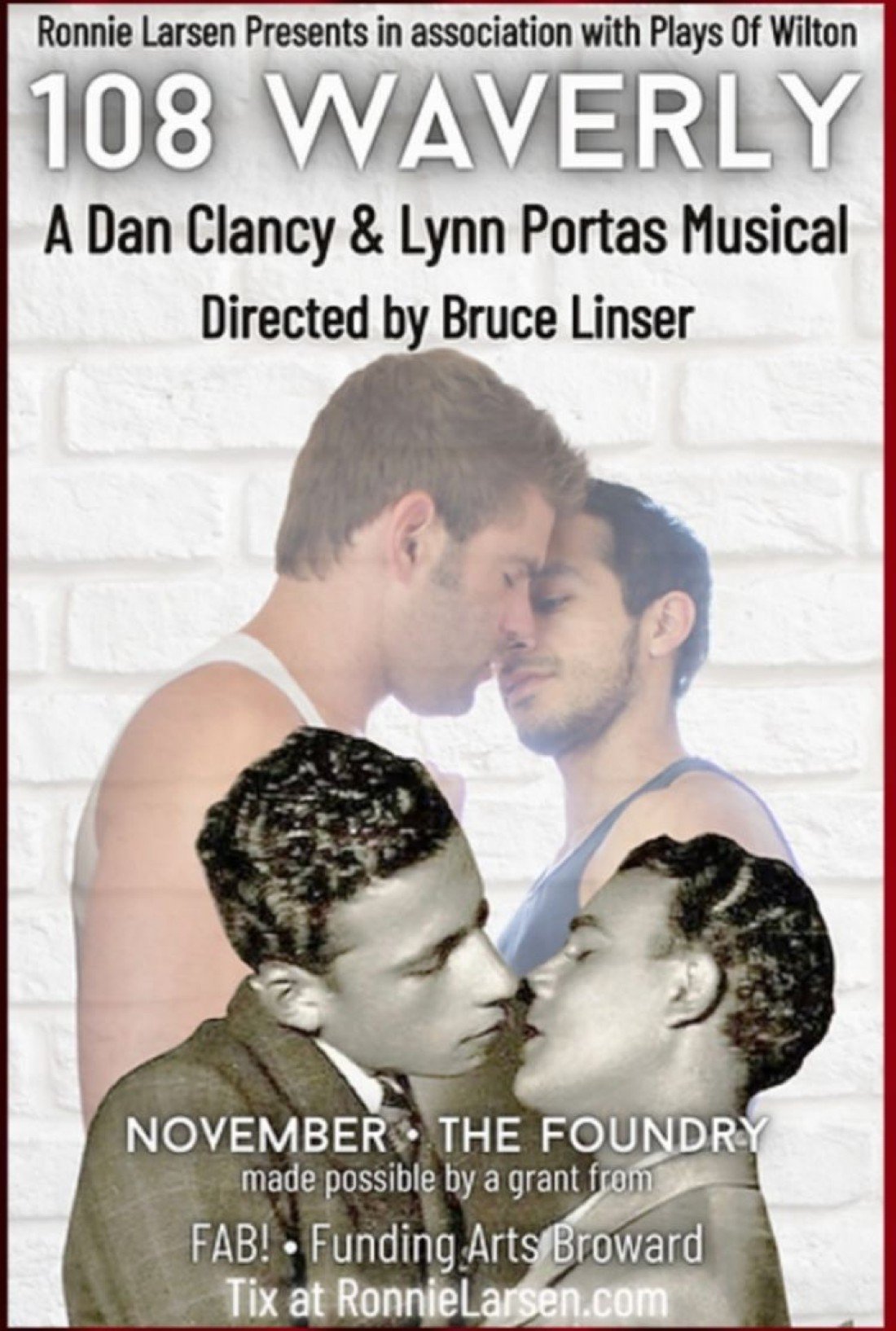 Ronnie Larsen Presents in association with Plays of Wilton (POW!) is presenting a production of the musical “108 Waverly” with book and lyrics by the Carbonell award-winning Dan Clancy and music by Lynne Portas in November 2023. This clever and heartfelt musical about love and relationships over 70 years is being directed by Carbonell award-winning director Bruce Linser. Two gay couples occupy the same apartment at the title’s location in Greenwich Village New York City. The two couples never meet as they occupy the space seven decades apart.
