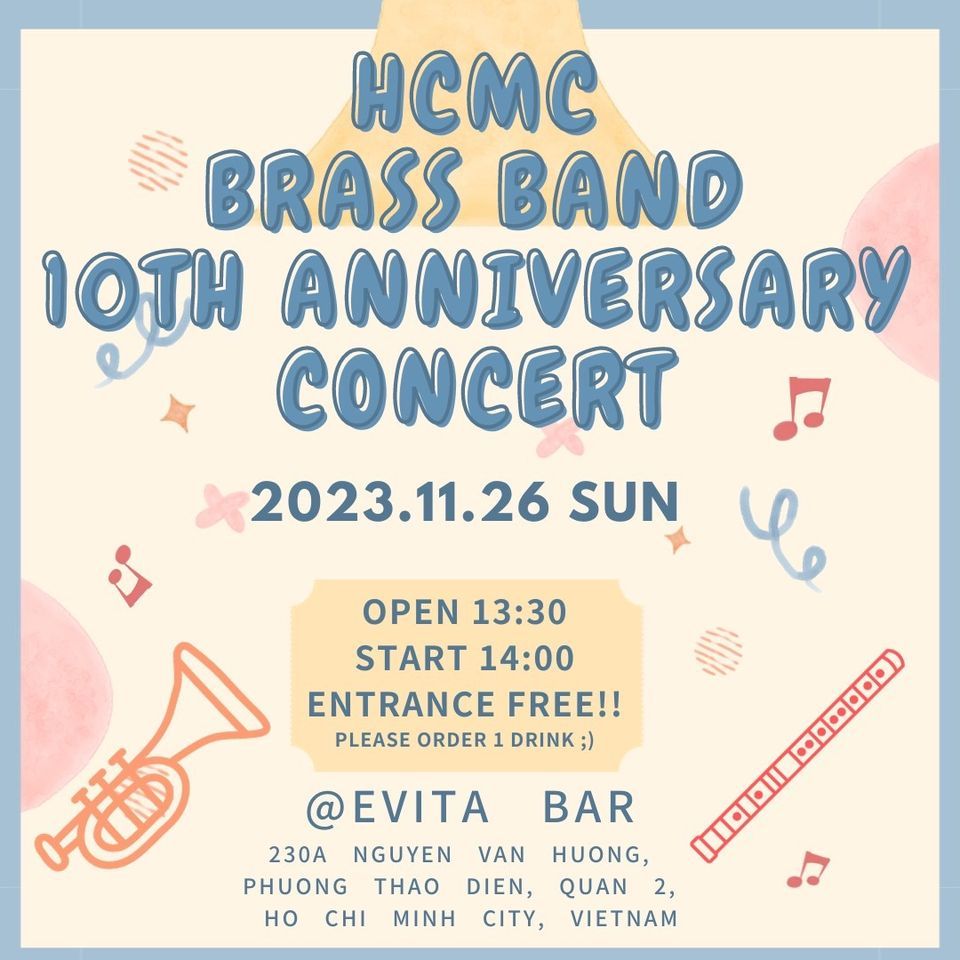 [English is after Japanese]在ホーチミンの音楽好き日本人が集まったHCMCブラスバンドが11月26日(日)に10周年コンサートを開催予定。結成10周年ということでOBやOGも参加予定。10周年ということで、過去の演奏会で演奏した曲を中心に新しい曲やアンサンブルもお届けします!! 大人も子供も楽しんでいただける曲をお届けします。