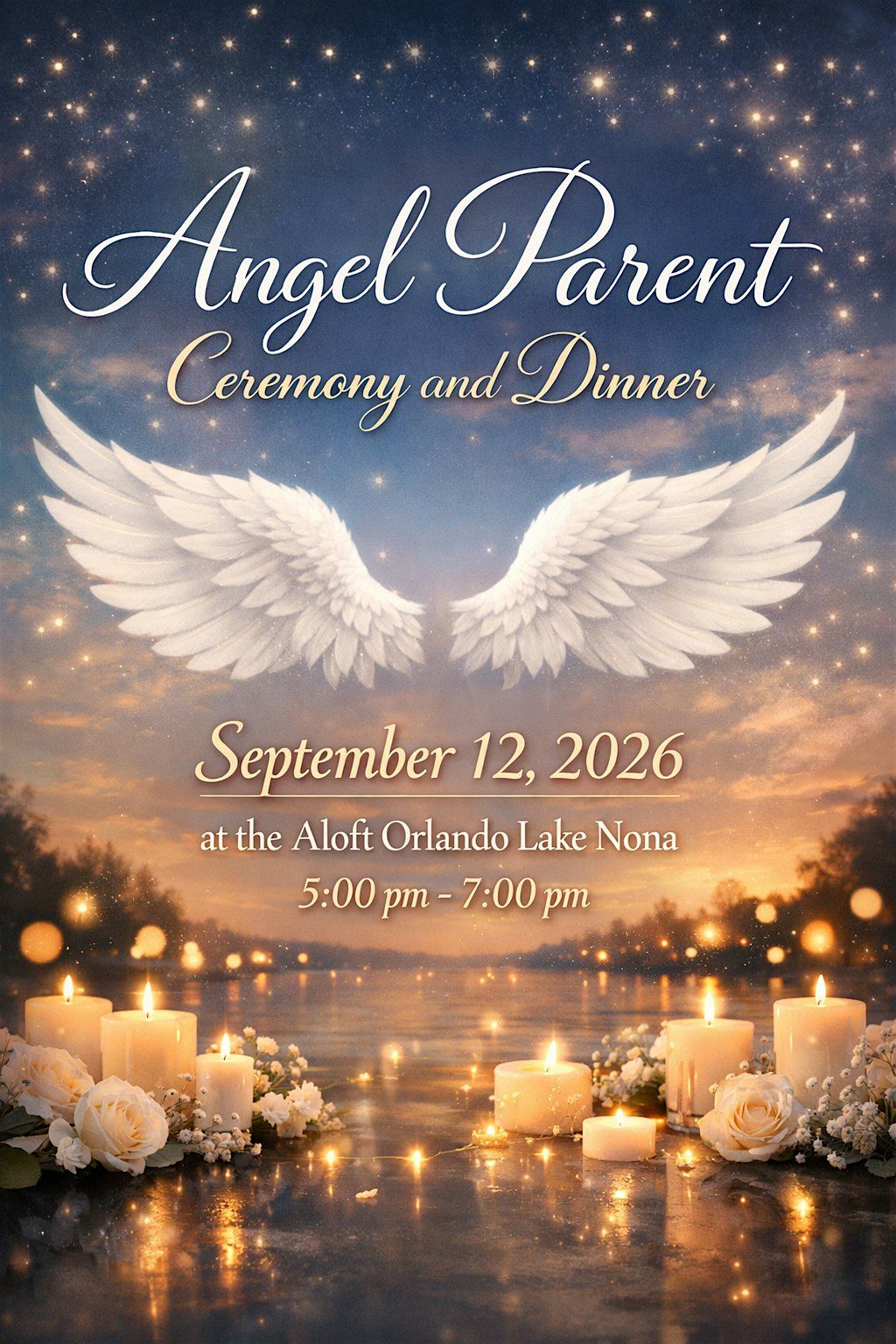 Come join us for a special evening at the 10th Annual In Loving Memory ANGEL PARENT CEREMONY AND DINNER! We will gather together to honor and remember our loved ones in a beautiful setting from 5:00 pm-7:00 pm. The ceremony and dinner will be held at the Aloft Orlando Lake Nona. A donation of any amount is required per person, please register each person individually for the proper head count. Do not register children 3 and under.