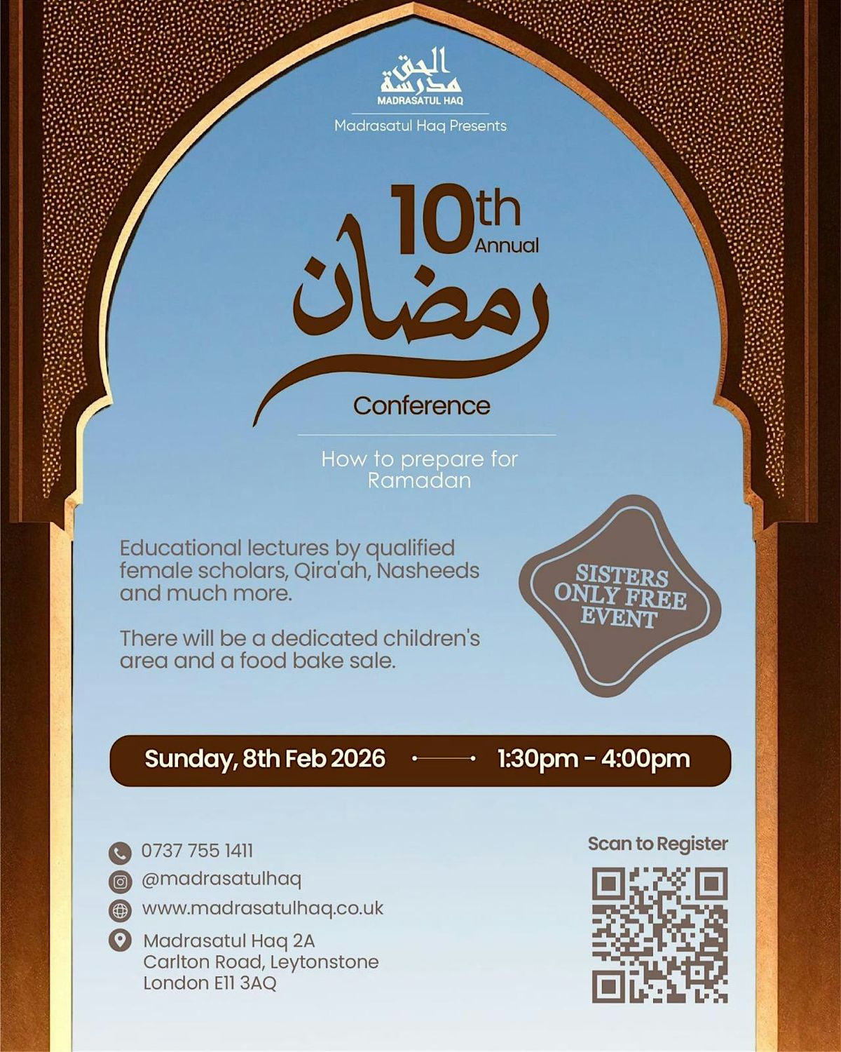 Welcome to the 10th Annual Ramadan Conference! Join us at Madrasatul Haq on February 8, 2026 at 1:30 PM for a day filled with inspiring and educational talks. It will be a day filled with reflections and spirituality. Dont miss out on an opportunity to get into the spirit of welcoming Ramadan inshaAllah!