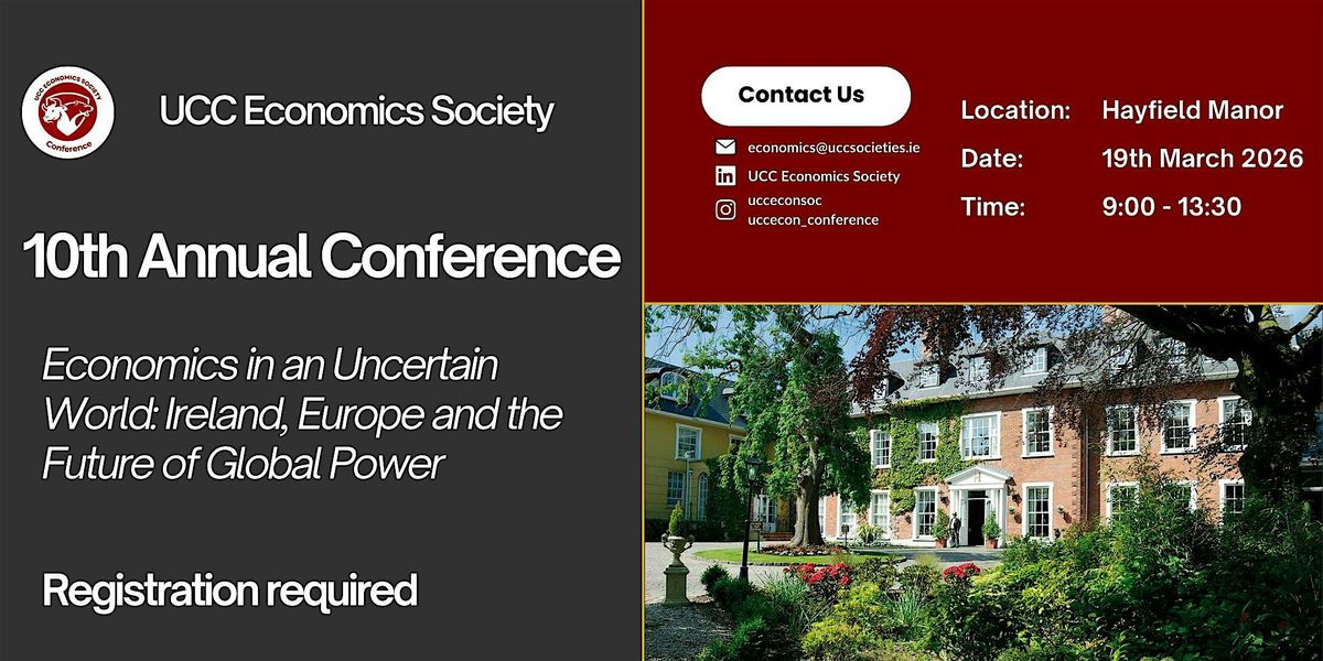 The 10th Annual UCC Economic Society Conference titled Ireland, Europe, and global power in uncertain times. The conference brings together leading economists, policymakers, financial experts, and international commentators to examine Ireland, Europe, and global power in an era of economic uncertainty. Hosted at Hayfield Manor Hotel in Cork, this year’s conference explores the evolving global economic landscape through three expert panels: Reflection of the Wealth of Nations 250 years on, Economics in Uncertain Times and Ireland’s Position in the Wider World, and Fiscal Policy and Irish Banking in Changing Times. Speakers from academia, government, finance, and international media will provide insight into geopolitics, economic statecraft, fiscal strategy, and the future world order. Taking place on 19 March from 9:00am to 1:30pm GMT, the event offers attendees an opportunity to engage with expert analysis, informed discussion, and forward-looking perspectives on the key forces shaping Ireland and the global economy.