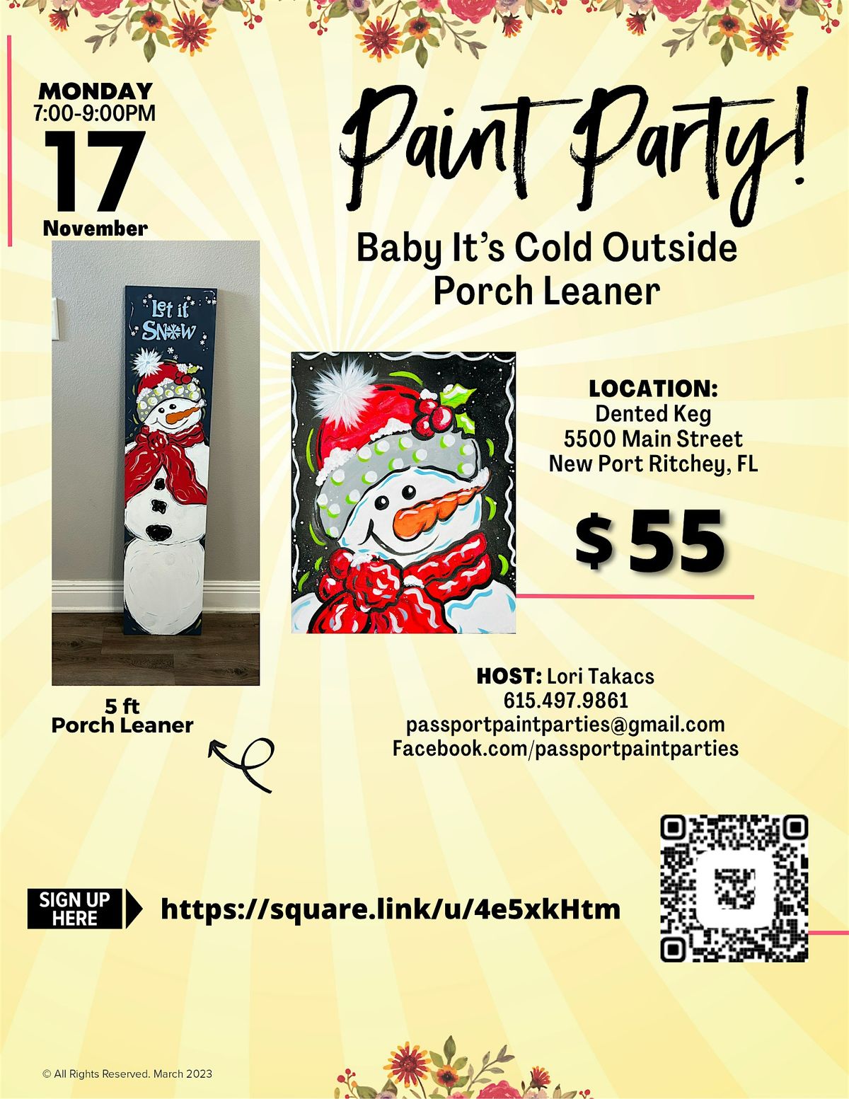 Create a festive and welcoming touch for your home this holiday season with the 'Baby It's Cold Outside' porch leaner. Featuring a charming snowman design, this handcrafted piece is perfect for adding winter-inspired decor to your front porch. Join us at Dented Keg for a fun paint-and-sip event to customize your own unique holiday decoration. All materials and guidance are provided to ensure a delightful creative experience.