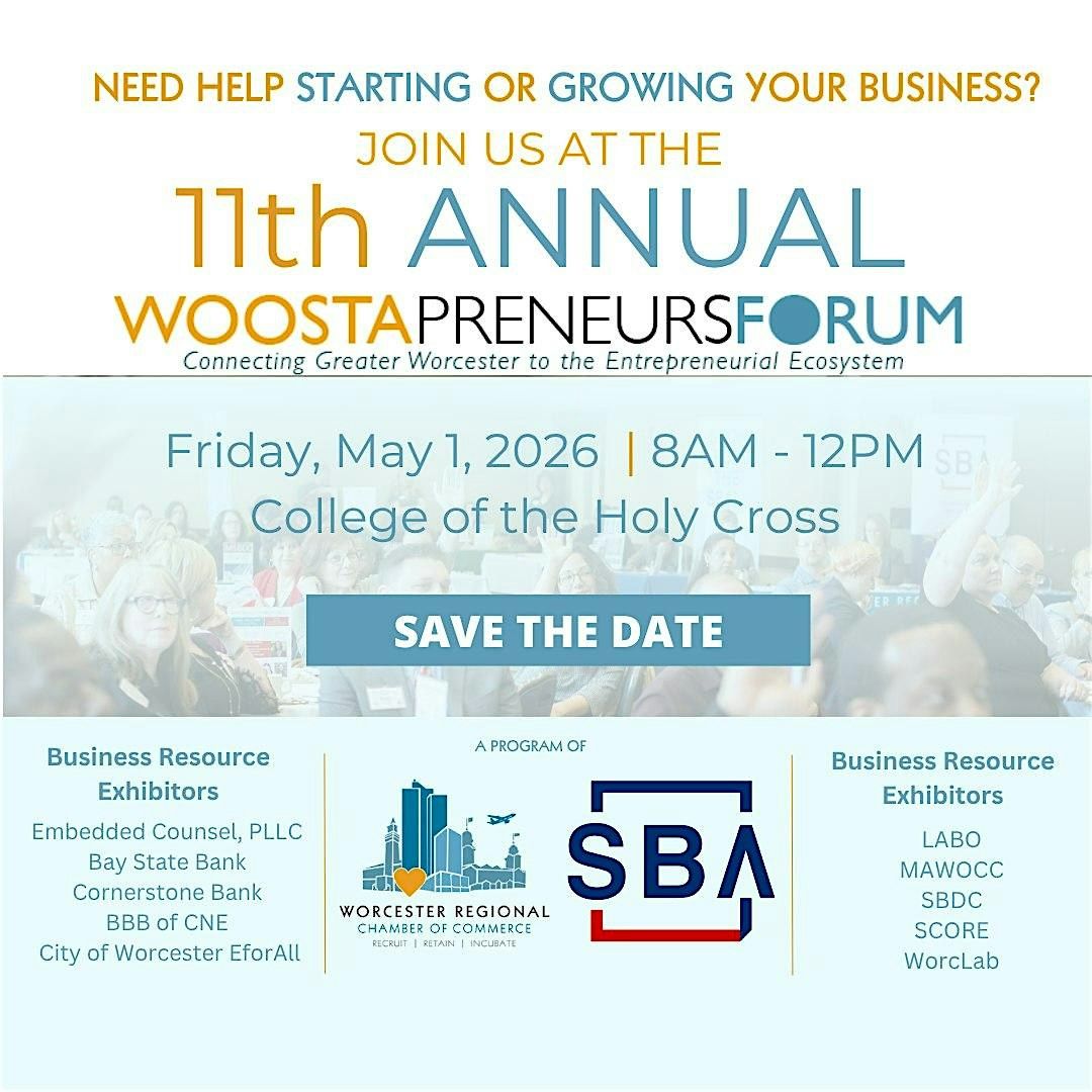 The Woostapreneurs Forum intends to connect Greater Worcester to the entrepreneurship ecosystem and business resource providers in central Massachusetts. The conference is designed for existing business owners, budding entrepreneurs, veteran entrepreneurs, millennial entrepreneurs, women-owned businesses, and other underserved entrepreneurs in search of business help. There will be a panel of business success stories, a resource panel discussion, as well as a keynote speaker and the opportunity for attendees to network with resource partners and supporters to learn more about the services they offer.