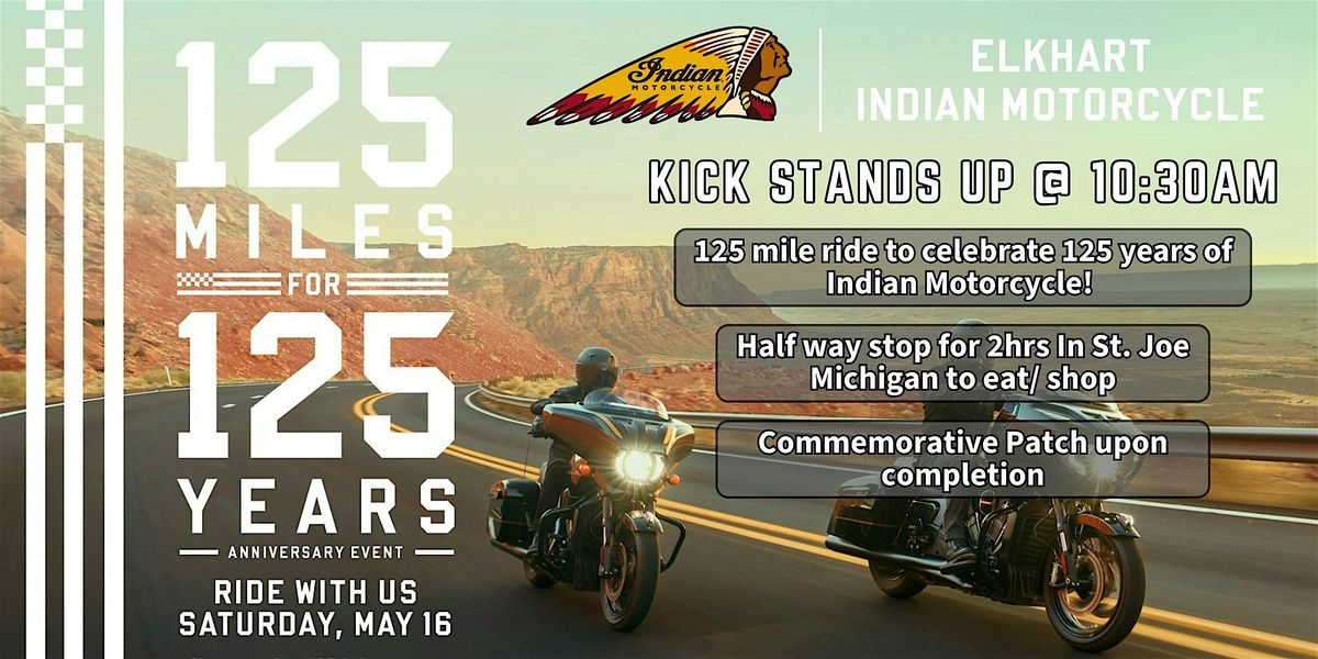 This 125 mile ride to celebrate Indian Motorcycle's 125 year anniversary will start and end at our dealership with a half way stop in St. Joe Michigan!