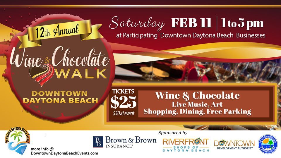 Another Distinctively Downtown Daytona Experience! The Wine & Chocolate Walk is sponsored by Brown & Brown Insurance, Downtown Development Authority and Riverfront Shops of Daytona Beach.