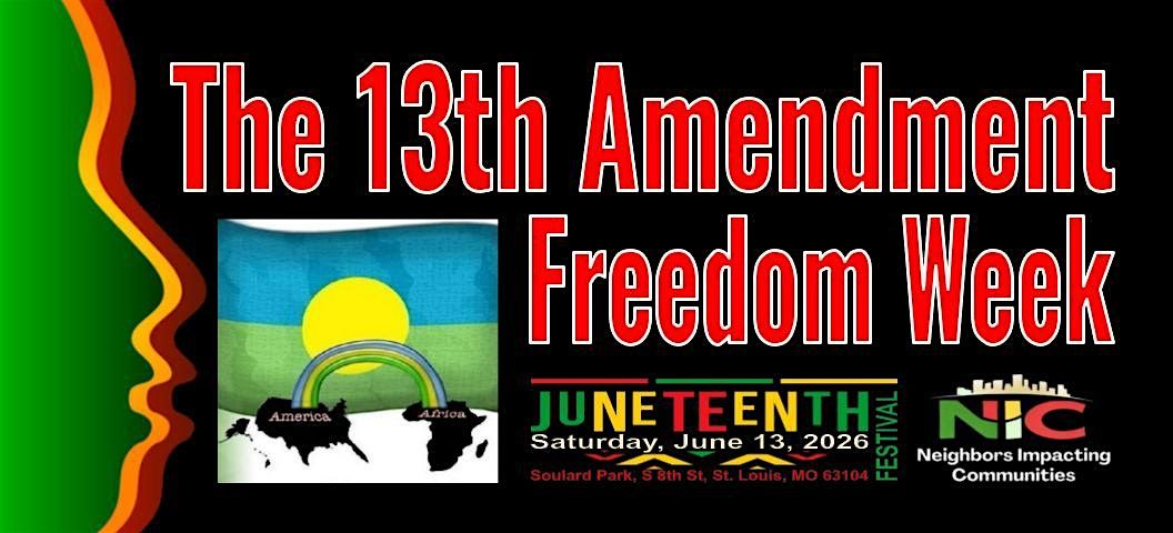 The 13th Amendment Freedom Week Movement is joining The Henlor Foundation’s Mister Juneteenth Scholarship Pageant and Neighbors Impacting Communities for their FOURTH annual Juneteenth Celebration in Soulard Park from 8 a.m. to 5 p.m. on Saturday, June 13, 2026, at Soulard Market Park in St. Louis, MO. Free and Open to the Public. Lafayette will be closed between 7th and 9th Streets for the entire day.