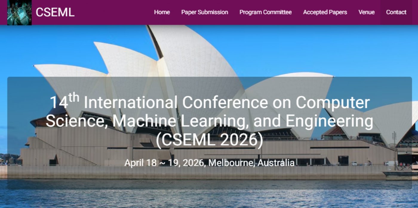 14th International Conference on Computer Science, Machine Learning, and Engineering (CSEML 2026) brings together leading researchers, practitioners, and innovators from across the global computing community to explore the rapidly evolving landscape of intelligent systems, advanced computation, and theoretical foundations. As breakthroughs in artificial intelligence, large scale machine learning, distributed systems, and computational theory continue to reshape science, industry, and society, CSEML 2026 serves as a premier forum for presenting cutting edge research, exchanging ideas, and fostering interdisciplinary collaboration.