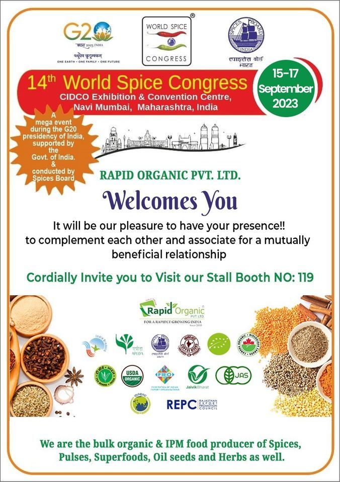 Join us at the 14th World Spice Congress from September 15th to 17th, where we, Rapid Organic, invite you to explore our stall at booth no. 119. Discover the finest organic spices and indulge in a sensory journey like no other. Mark your calendars and experience the world of flavour.#worldspicecongress #g20 #spiceboard #sustainable #gogreen #goorganic #networking #tradeshows #network #food #ecopreneur #indianfoodsystem #agriculture #bioproducts #organicfood #organicproducts #Rapidorganic