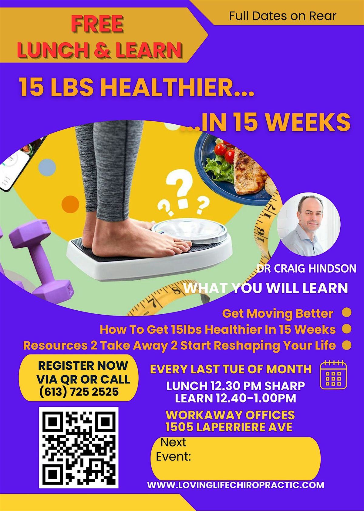 My name is Dr Craig Hindson of Loving Life Chiropractic in Westboro, Ottawa and since recovering badly lost health after returning from my 3rd war zone in 2003, I have been helping people from all walks of life, move better, think better, eat better, and rest better ... and this is your "Stay Fit While You Sit" - Free Lunch and Learn :)