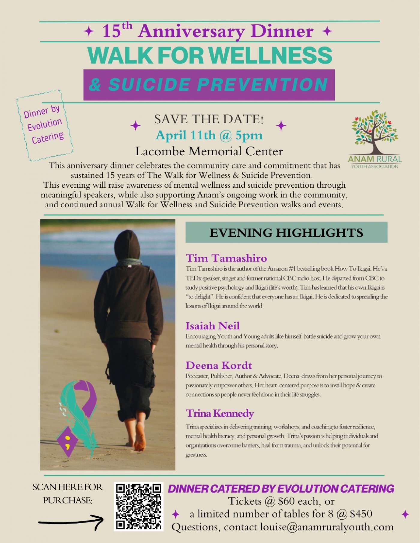 This evening will raise awareness of mental wellness and suicide prevention through meaningful speakers, while also supporting Anam’s ongoing work in the community, and continued annual Walk for Wellness and Suicide Prevention walks and events.
