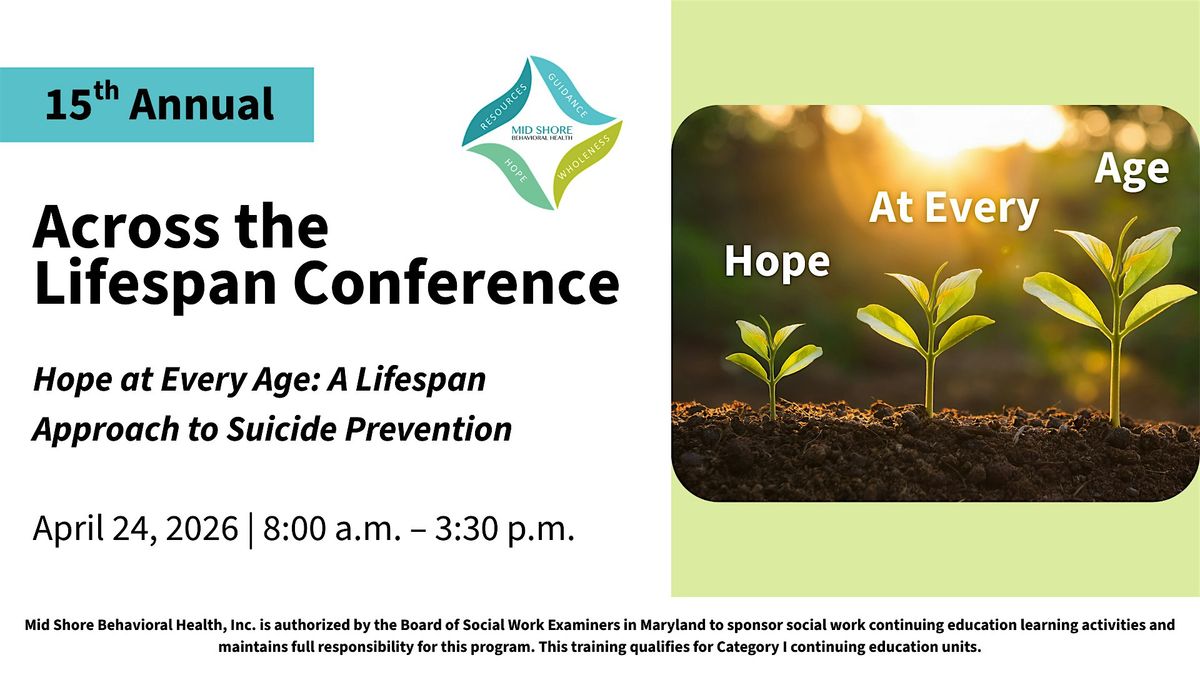 Mid Shore Behavioral Health, Inc. (MSBH) presents the 15th Annual Across the Lifespan Conference: Hope at Every Age: A Lifespan Approach to Suicide Prevention. This event will take place at the Miles River Yacht Club in St. Michaels on Friday, April 24th, 2026, from 9:00 AM – 3:30 PM (doors open at 8:00 AM). The conference will focus on suicide prevention across the lifespan, highlighting youth, young adults, adults, and older adults. Attendees will gain practical tools, hear lived and professional perspectives, and explore prevention strategies that foster connection, resilience, and hope at every stage of life.