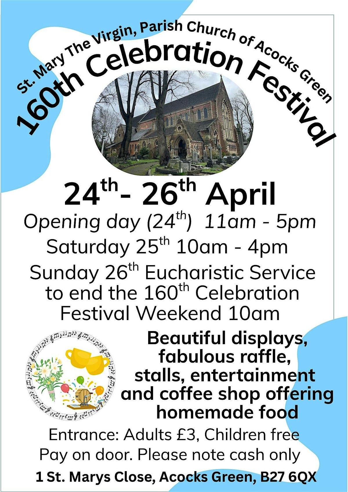 A wonderful two days celebrating 160 years of St. Mary's Church, Acocks Green. Displays, stalls, entertainment, refreshments and raffle.