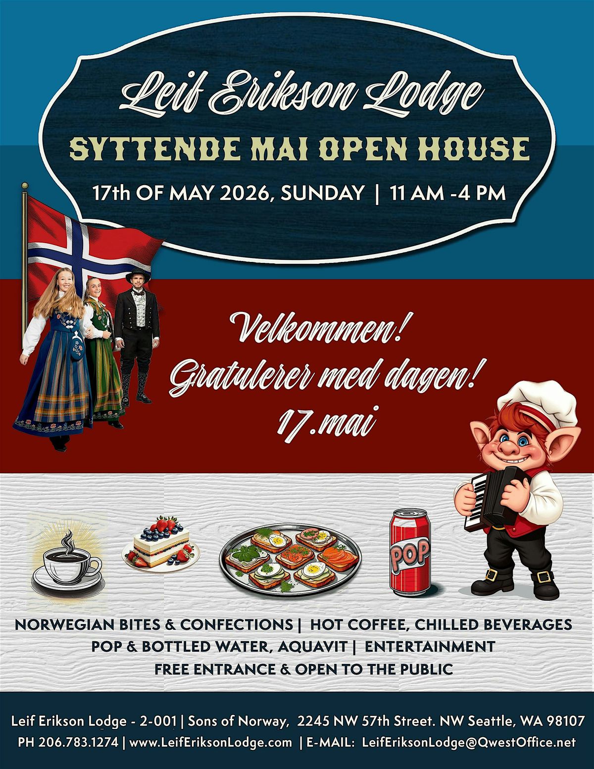 Join us on Syttende Mai, or May 17th, to celebrate Norway's Constitution Day at Leif Erikson Hall in the heart of Ballard! From Noon until 4:30 PM, our Open House will have food, entertainment, and representatives of the Nordic community ready to talk with you about the different Nordic organizations around Seattle.