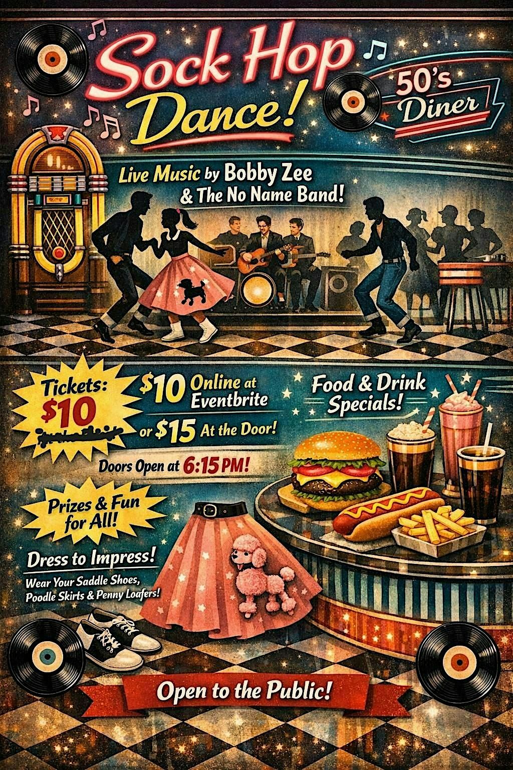Join us for a 1950's style sock hop that's all about good vibes, classic tunes, and dancing the night away. Dress up in your coolest retro threads and step back in time to an era of poodle skirts, leather jackets, and rock 'n' roll beats.