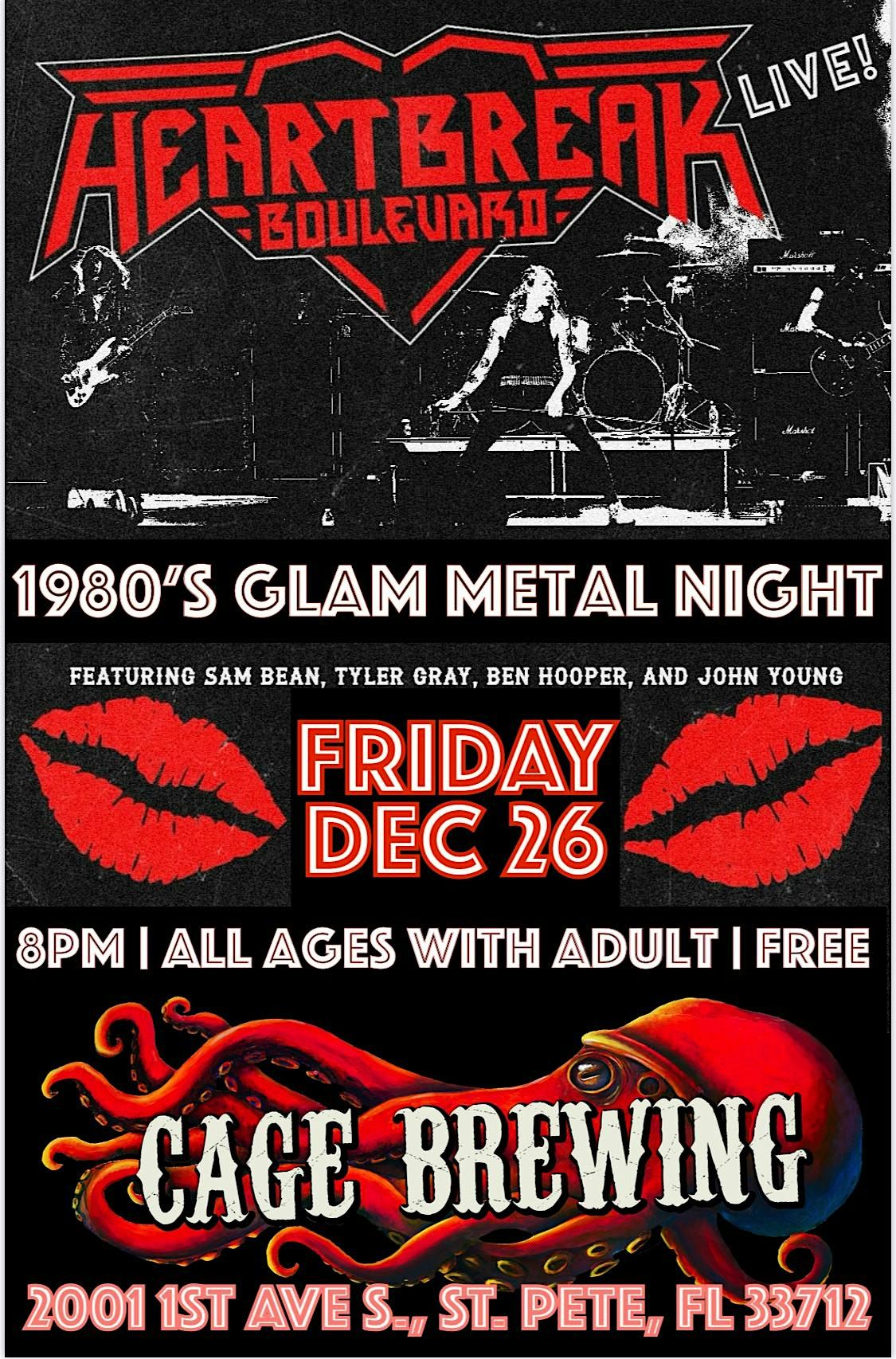#CageBrewing #KrakenJoesPizza #HeartbreakBoulevard #GlamMetalNight #80sMetal #StPetesBestBackyard #StPeteEvents #LiveMusicStPete #FreeShow #AllAgesShow #LocalMusicFL #StPeteNightlife #SupportLocalMusic #FridayDecember26 #BeerMusicPizza
