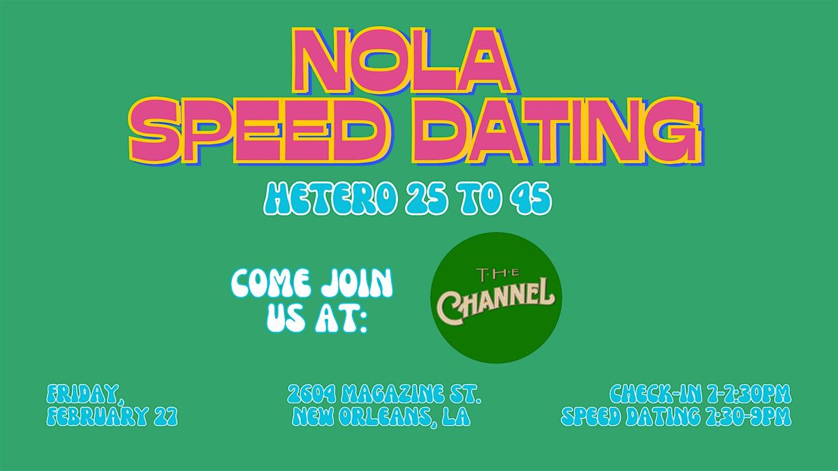 Thank you for your interest in attending a NOLA Speed Dating Event! We will be hosting this round at The Channel at 2604 Magazine St. This event is designed for people attracted to the opposite gender between the ages of 25 to 45.