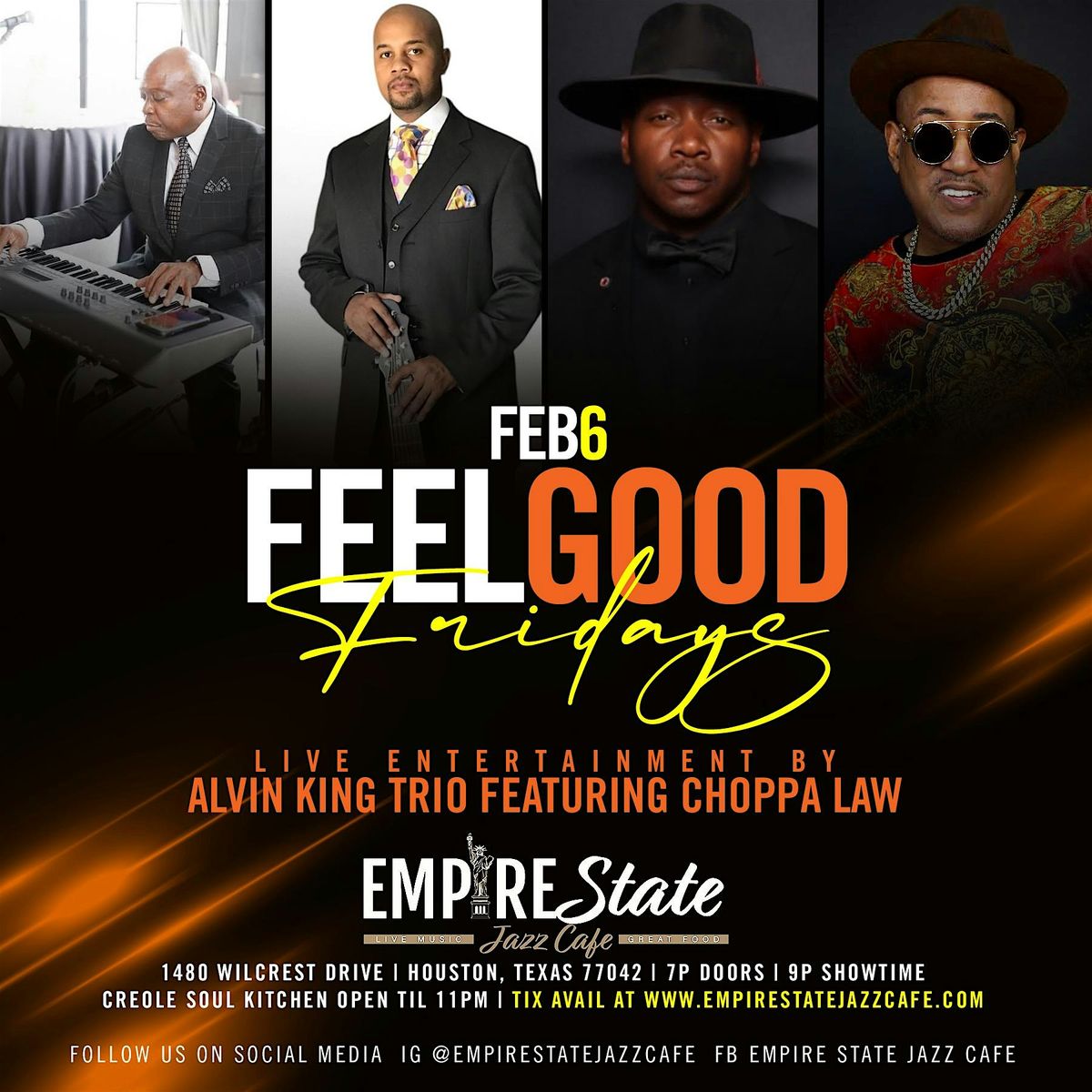 Welcome to **Feel Good Fridays** at Empire State Jazz Cafe! 🎶 Join us on **February 6, 2026 at Doors 7:00 PM | Showtime 9:00 PM** for a night of soulful music with the **Alvin King Trio** featuring **Choppa**. Get ready to groove to some amazing tunes in a cozy and intimate setting at our venue. Don't miss out on this opportunity to unwind and enjoy great live music with friends and fellow music lovers. See you there! (Central Time)