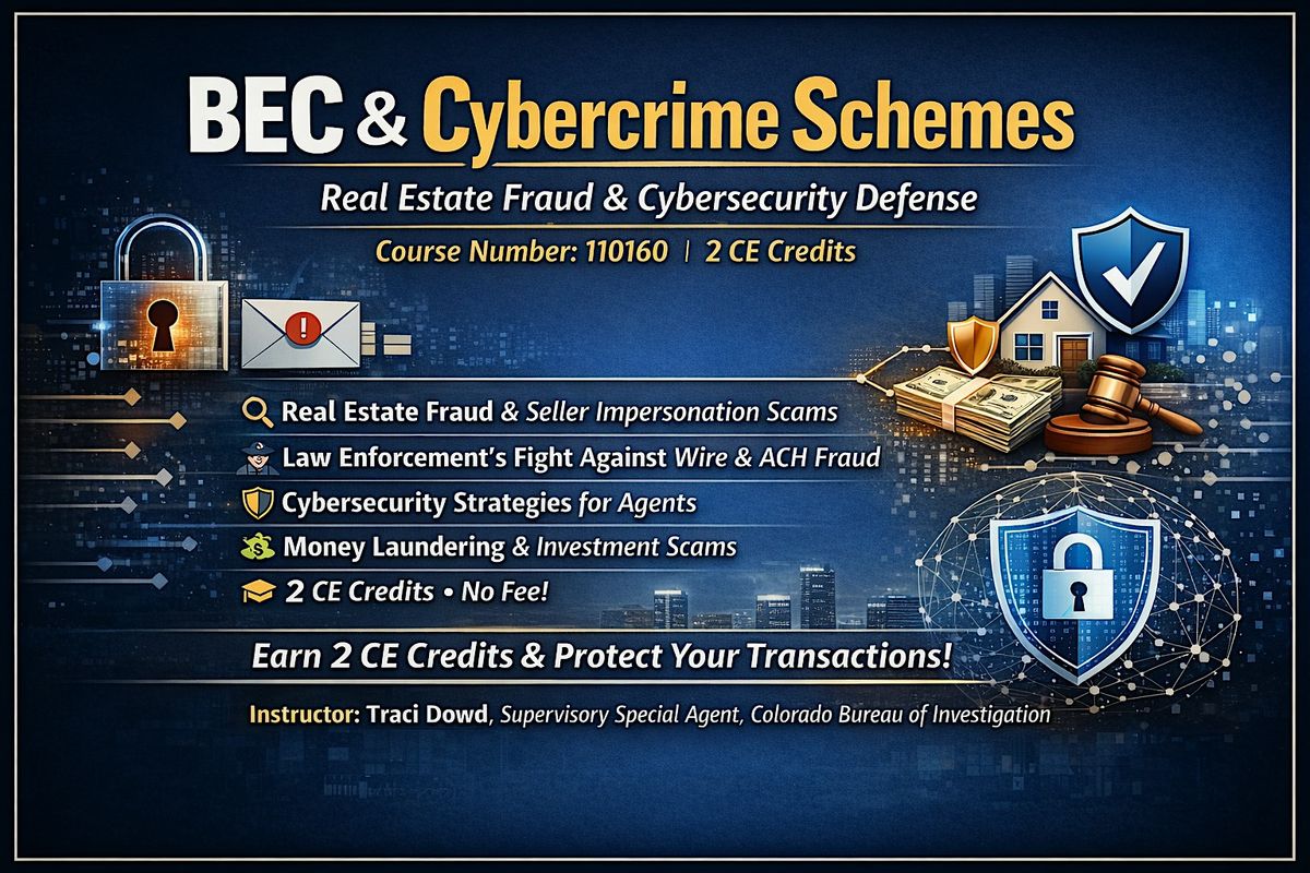 BEC & Cybercrime Schemes (Course #110160) is a must-attend class for real estate agents who want to protect clients, commissions, and closings while earning 2 CE Credits at no fee.
