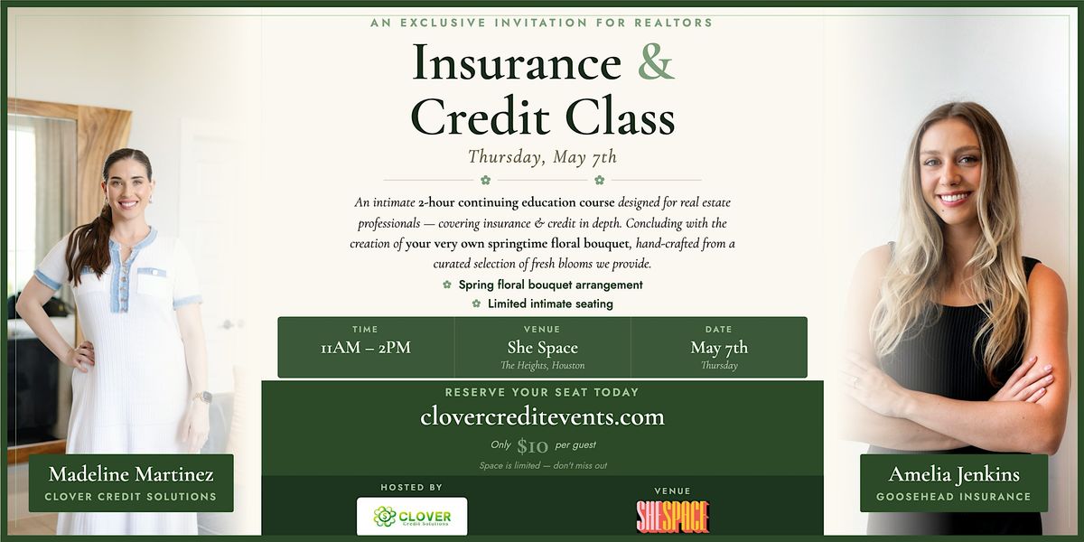 Hosted by Madeline Martinez of Clover Credit Solutions and Amelia Jenkins of Goosehead Insurance, this intimate 2-hour continuing education course will walk you through the essentials of credit and insurance — giving you the knowledge and confidence to better serve your clients and grow your real estate business.