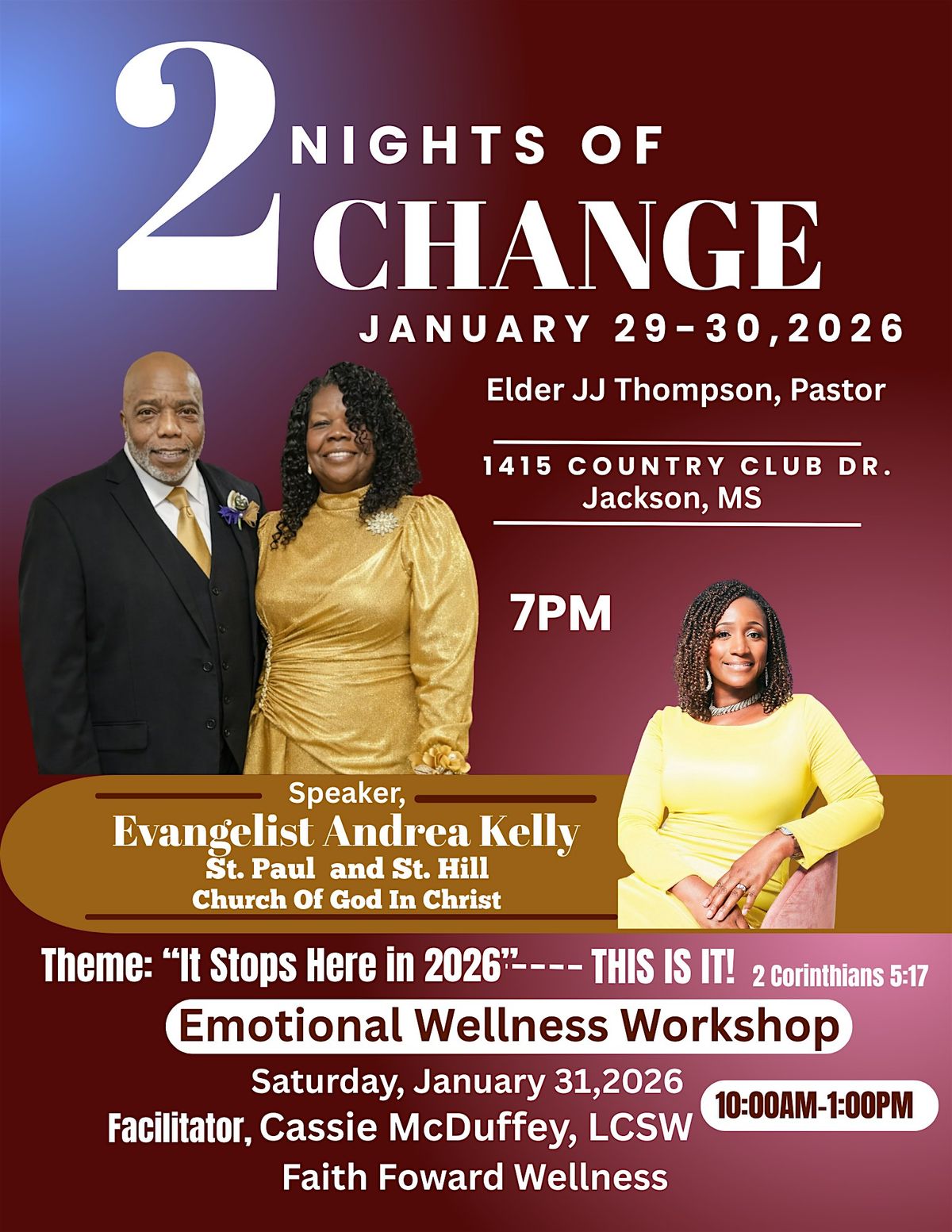Join us for two powerful nights of Change on January 29 & 30, featuring our anointed guest speaker, Evangelist Andrea Kelly. Come expecting to be saved, delivered, and set free!