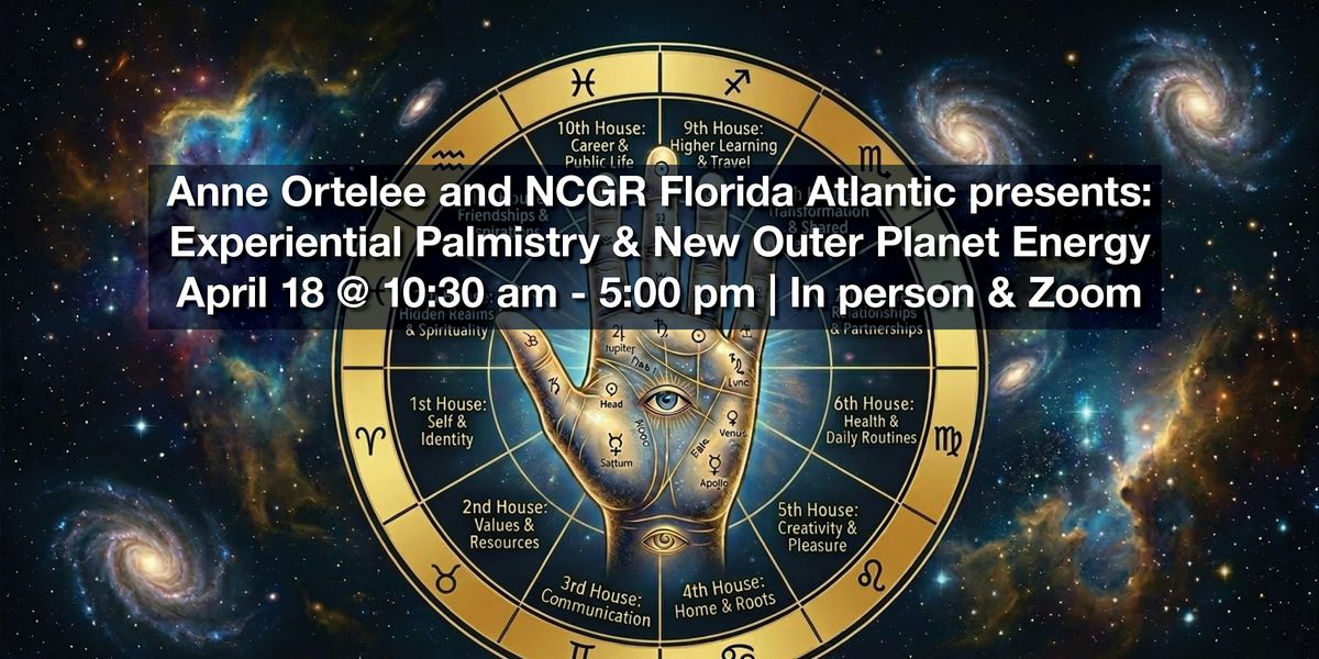 Join us as we learn more about ourselves through our palms and find ways to work with planetary energies at our workshop at Nova Southeastern University (NSU) in Davie, FL (also hybrid online via Zoom). The slow moving outer planets are moving into new elements and the world is shifting with them. Explore ways of working with this energy with an astrological expert!