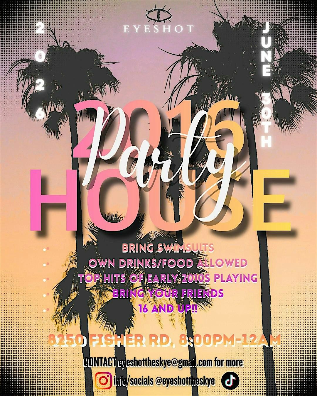 Get ready for a nostalgic blast from the past! On June 30th-midnight, 2026, relive the summer of 2016 at an exclusive house party in the Houston/Galveston area. Starting at 8 PM and going until midnight, this party is for ages 16 and up, featuring the hottest 2016 hits all night long. Enjoy a refreshing dip in the pool, dive into our fun ball pits, and indulge in plenty of food and drinks. For overnight stays, special guests can stay by referral from EYESHOT members, or others can pay for a room in the EYESHOT house. This is a one-in-a-lifetime experience, so grab your tickets early and send in your song requests before May 1st, 2026. Expect to hear bangers from Fetty Wap, Kesha, and more!