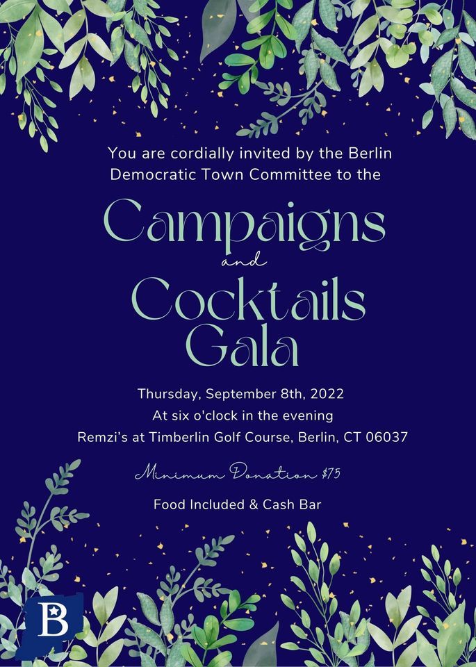 You are cordially invited by the Berlin Democratic Town Committee to the 2022 Campaigns & Cocktails Gala!Thursday, September 8th, 2022 @ 6pm