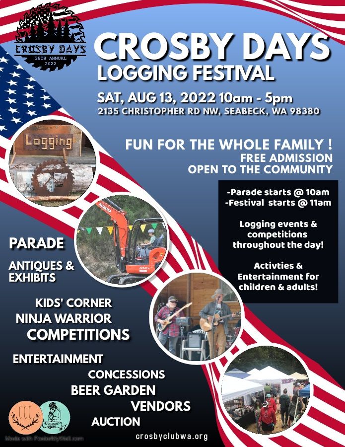 Parade, logging events & competitions, Kids area, exhibits, music, vendors, food & more!